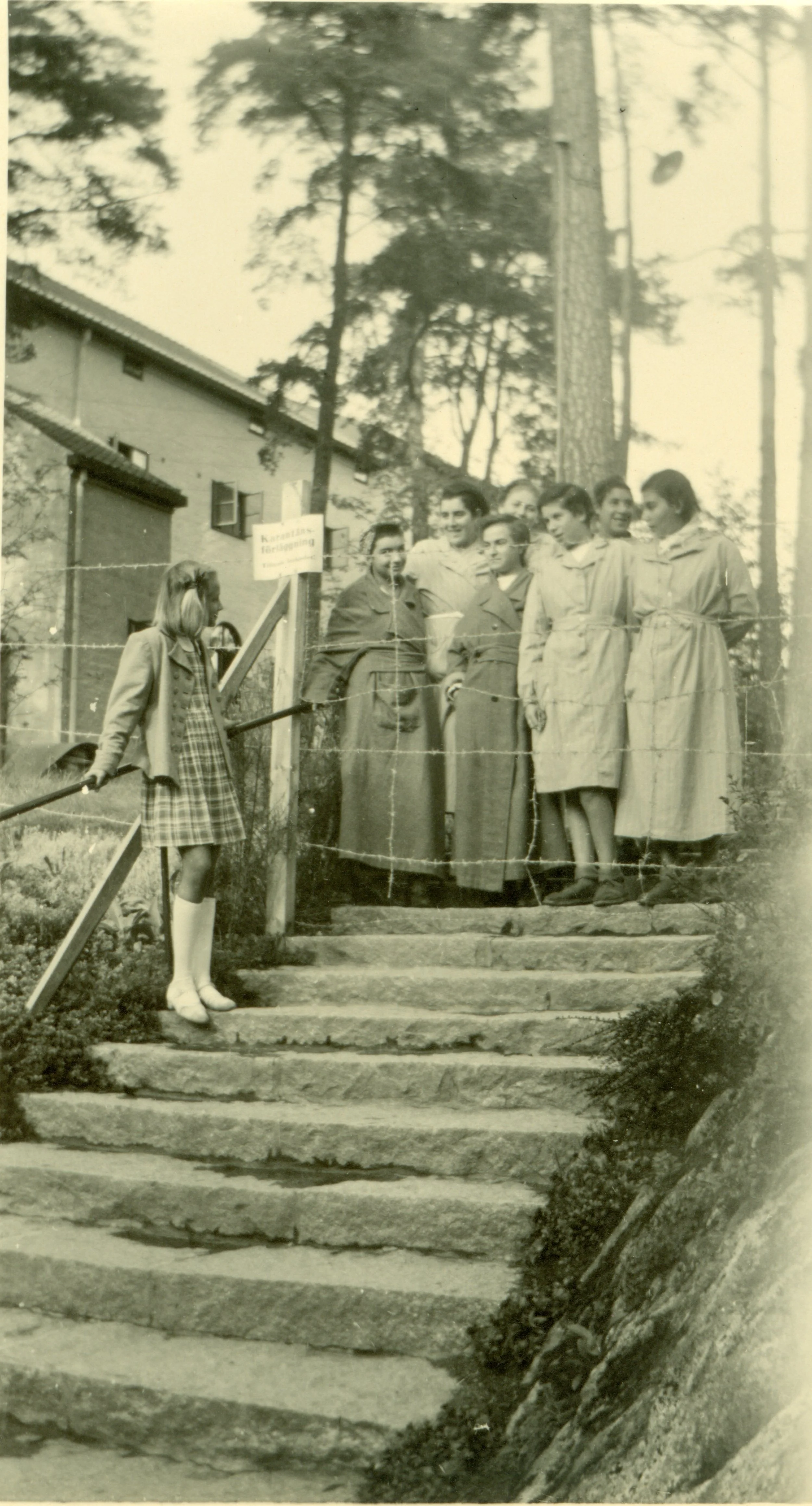 Överlevande flickor står innanför taggtrådsstaketet vid Sigtunastiftelsen, i samtal med en svensk flicka på utsidan. Staketet markerade karantänsområdet som upprättats vid ankomsten sommaren 1945. Foto ur Marthe Rydbacks samling, Sigtunastiftelsens arkiv.