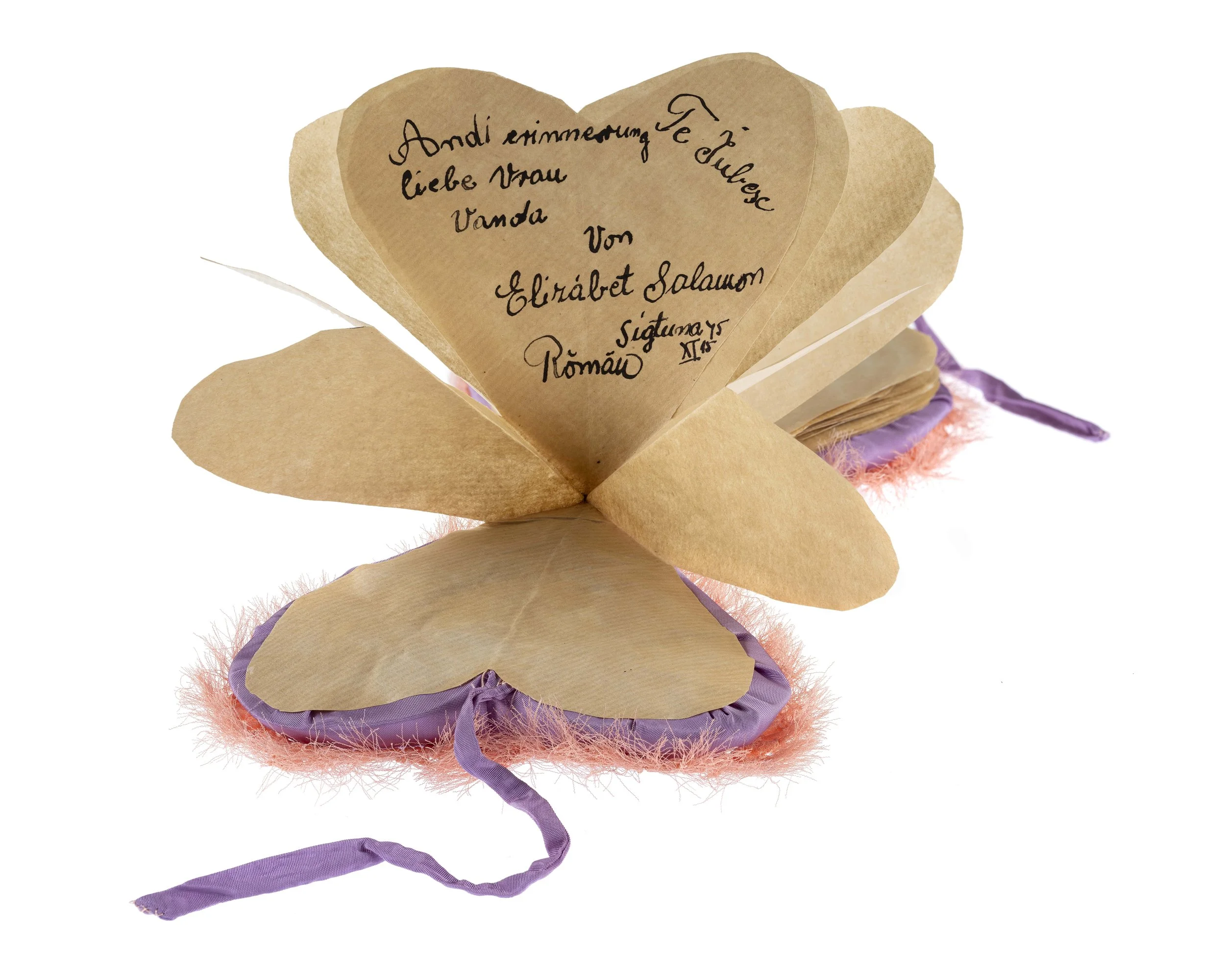Hjärtformad minnesbok, Sigtuna 1945. En tackgåva till Wanda Lanzer, kurator på beredskapssjukhuset i Sigtunastiftelsens lokaler. I det lilla hjärtat har flera av kvinnorna som vårdades i Sigtuna – efter att ha befriats från koncentrationslägret Bergen-Belsen – skrivit sina hälsningar. En stillsam påminnelse om omsorg, överlevnad och relationen mellan dem som hjälpte och dem som överlevt.