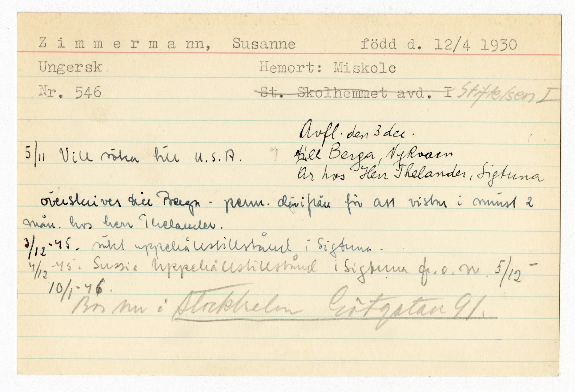 Registerkort för Susanne Zimmermann, sommaren 1945.