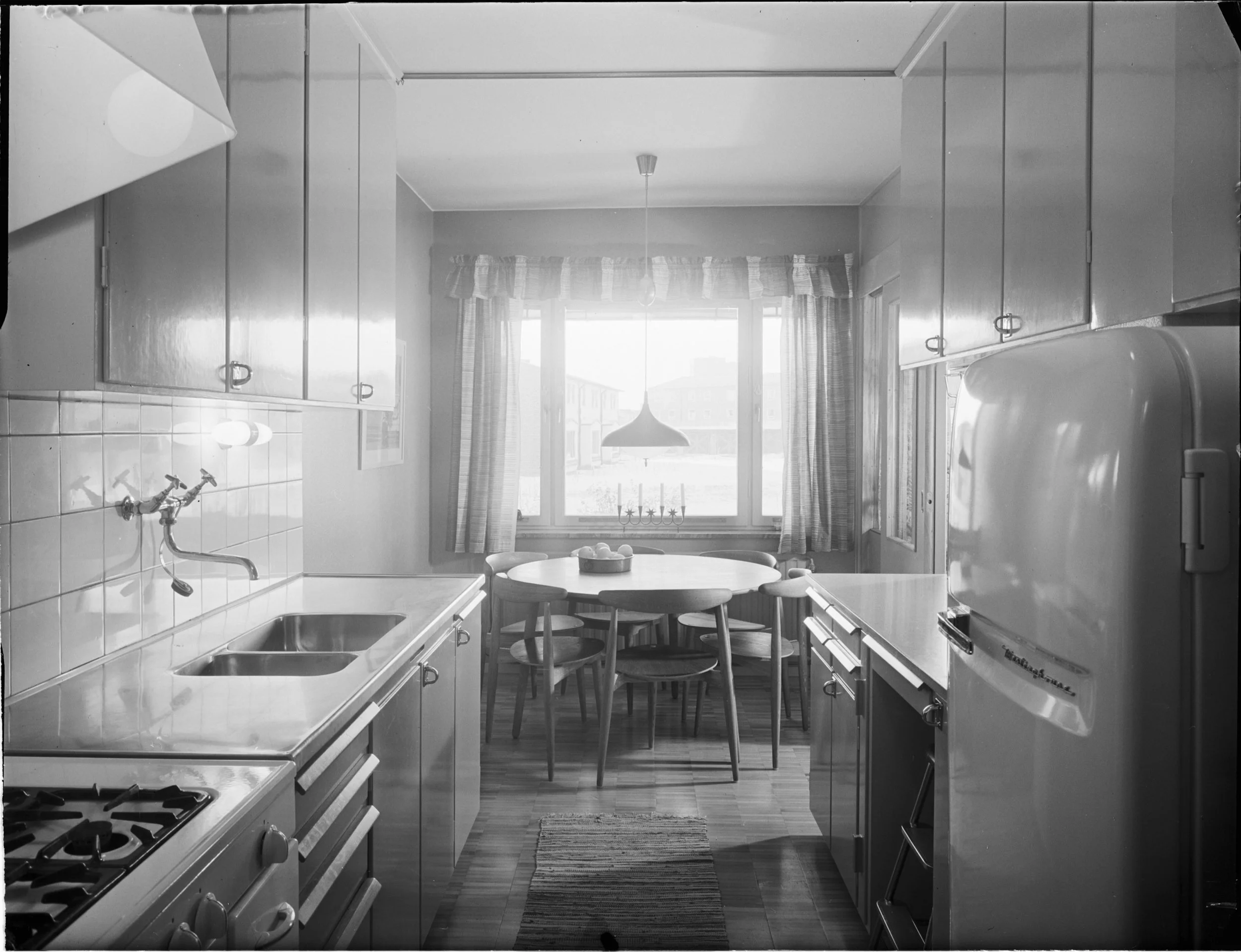 Ett modernt kök i Vällingby, 1955. Foto: Lennart af Petersens. Stadsmuseet.