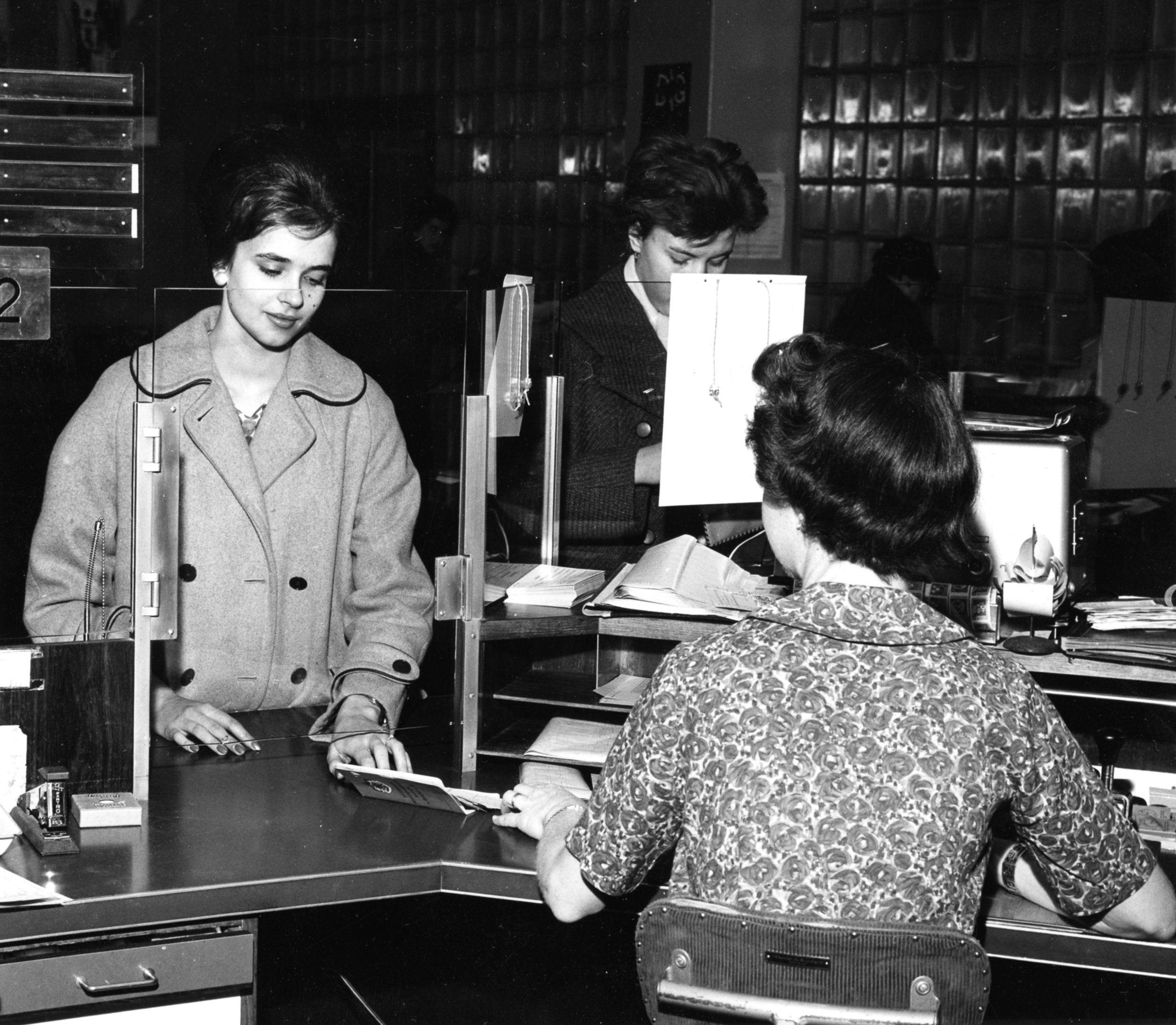 Postkontoret i Vällingby, 1960. Här skickades brev och paket, räkningar betalades och pengar hämtades ut – ett vardagens nav innan digitala tjänster fanns. Arbetet i centrum bar upp både hushåll och samhälle. Foto: Karl-Erik Karlsson. Postmuseum.
