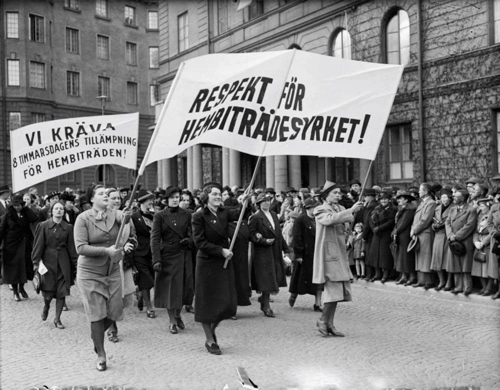 Vår tids diskussioner om hushållsnära tjänster har sin föregångare i folkhemmets debatter om hembiträdet. På 1930-talet var det den största yrkesgruppen i Stockholm. I Sverige var det över 50 000 flickor eller ogifta kvinnor som ofta bodde i jungfrukammare eller kök. 1938 samlades dom på Karlaplan för att bland annat demonstrera för åtta timmars arbetsdag för hembiträdet.