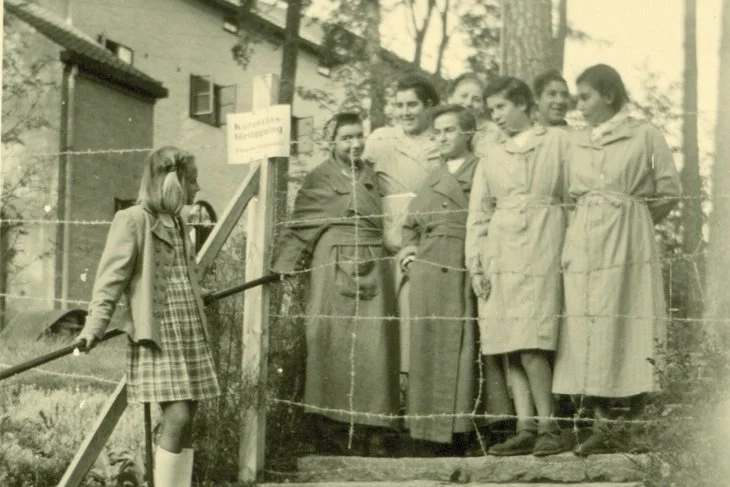 Överlevande flickor står innanför taggtrådsstaketet vid Sigtunastiftelsen, i samtal med en svensk flicka på utsidan. Staketet markerade karantänsområdet som upprättats vid ankomsten sommaren 1945. Foto ur Marthe Rydbacks samling, Sigtunastiftelsens arkiv.